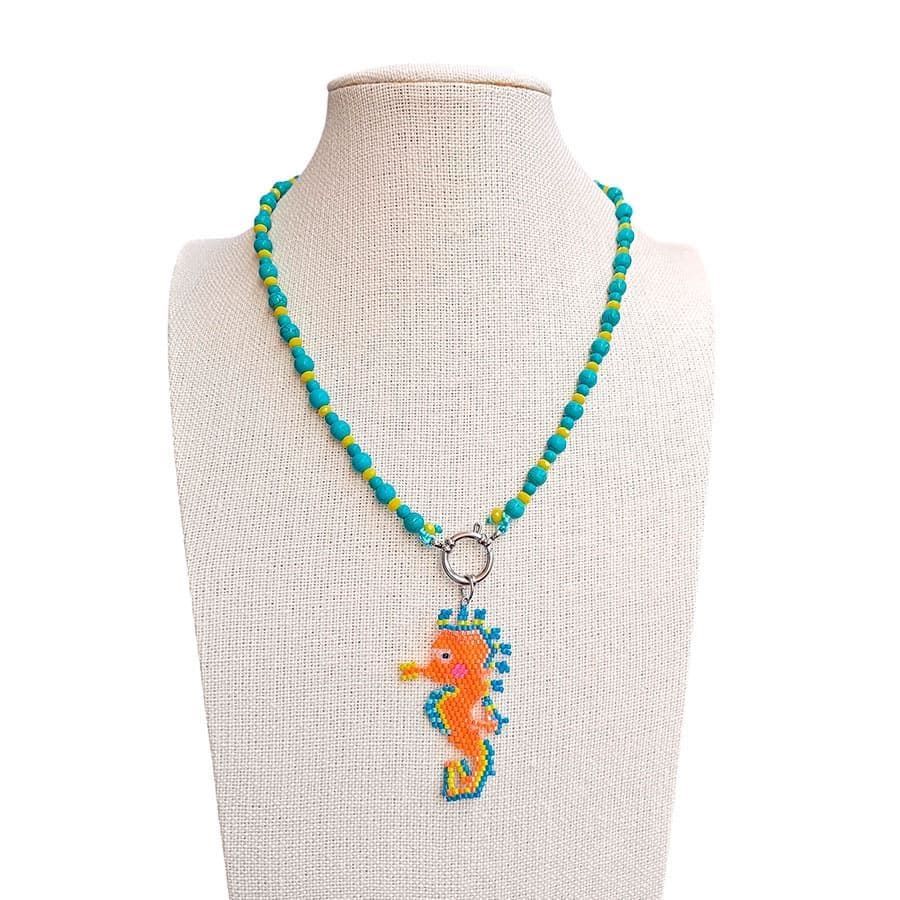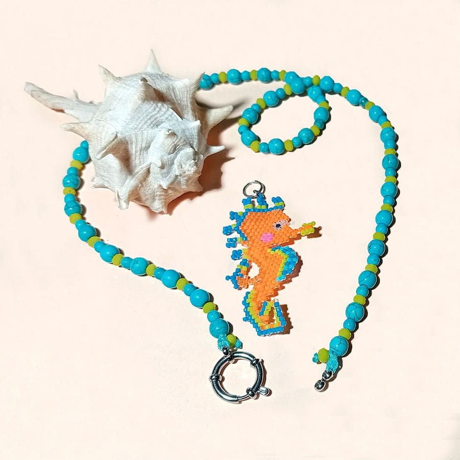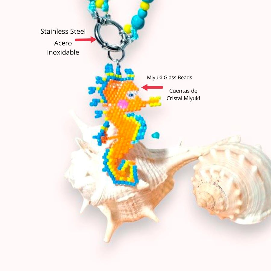 Cada collar es cuidadosamente elaborado por manos expertas, garantizando calidad y exclusividad en cada detalle. El colgante de caballito de mar, colorido y lleno de vida, cuelga de un cordón con cuentas redondas imitación turquesa que aportan un aire natural y sofisticado a la vez.
