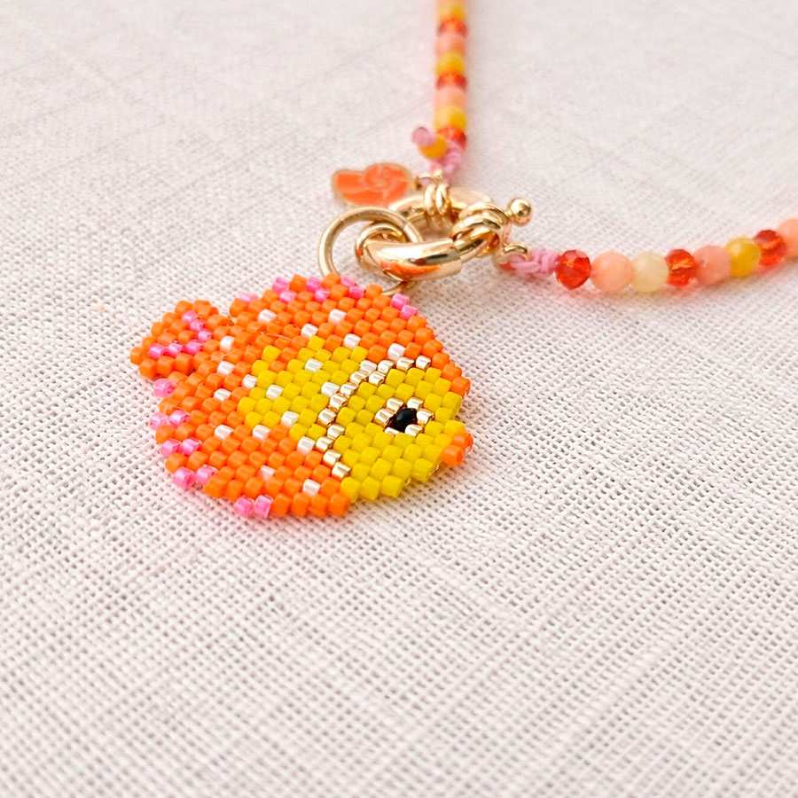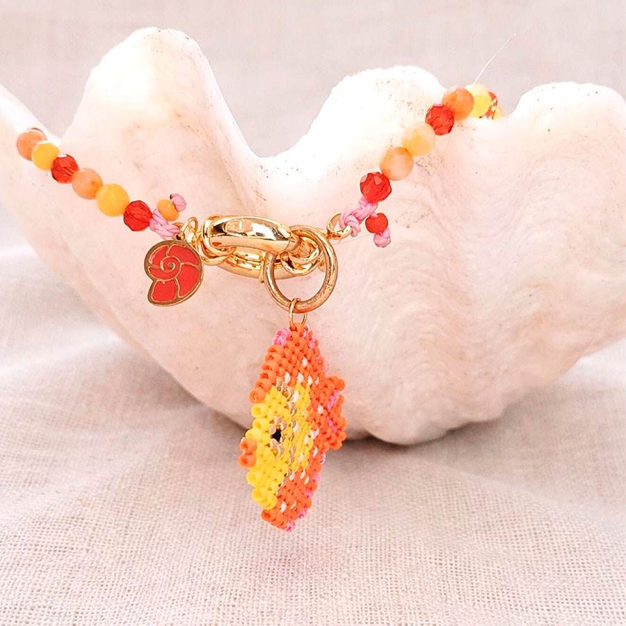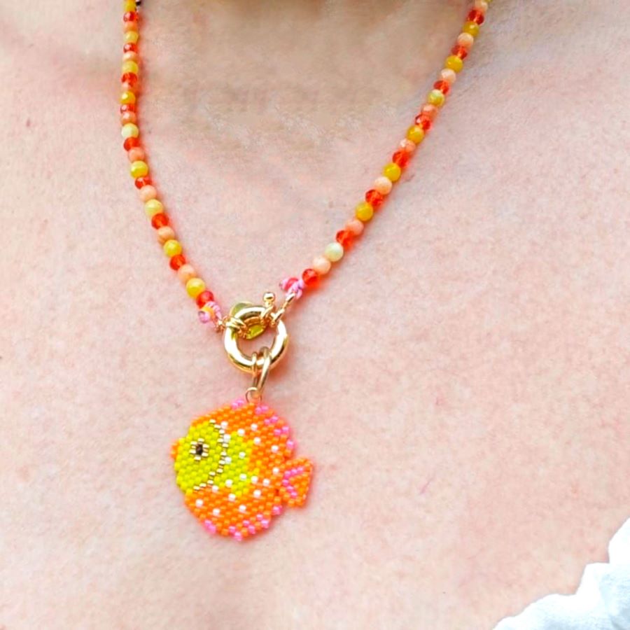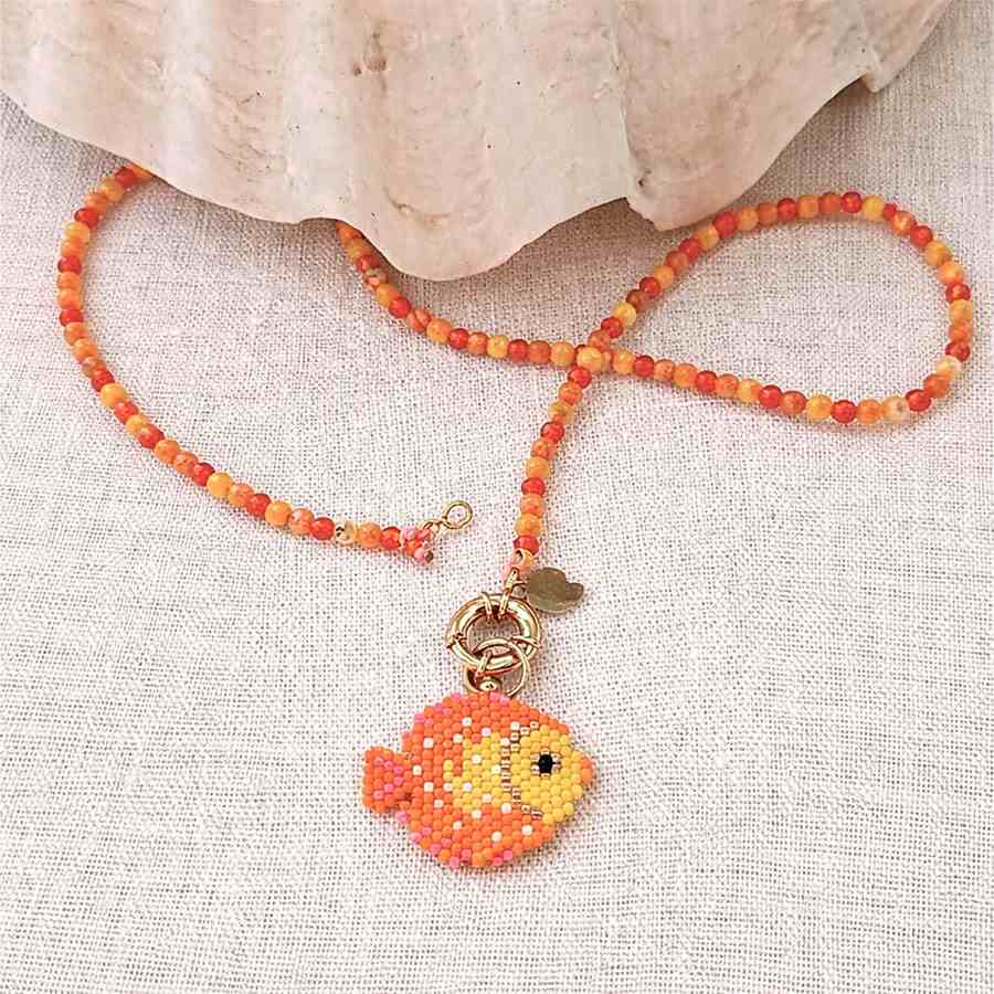La cadena del collar pez tropical está montada con cuentas de jade teñido en color naranja, combinadas con cuentas de cristal que aportan luz y movimiento. Los tonos cálidos evocan atardeceres junto al mar y paisajes costeros llenos de vida.