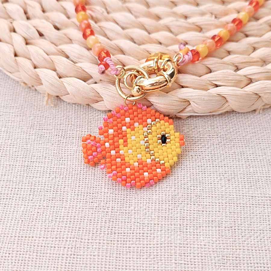Collar pez tropical está elaborado completamente a mano por mí, siguiendo los principios de la slow jewelry. El colgante con forma de pez se teje cuidadosamente con cuentas de cristal Miyuki, una a una, en un proceso paciente que convierte cada pieza en algo único e irrepetible.
