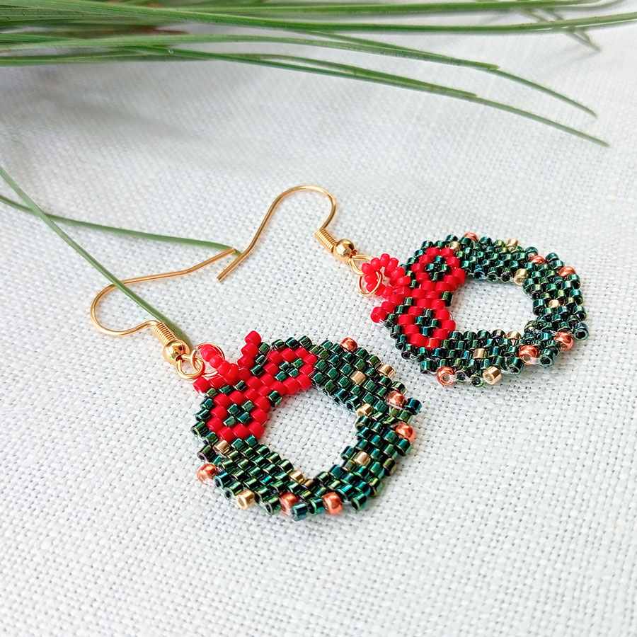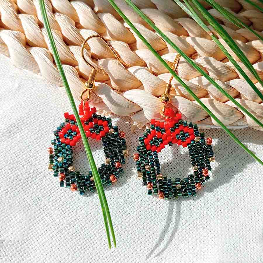 El diseño representa una corona navideña tradicional reinterpretada de forma original y alegre, con tonos verdes profundos, detalles dorados y pequeñas cuentas rojas que forman un lazo festivo. Los pendientes cuelgan de ganchos de acero inoxidable dorado, que aportan elegancia, durabilidad y resistencia, además de ser adecuados para pieles sensibles.