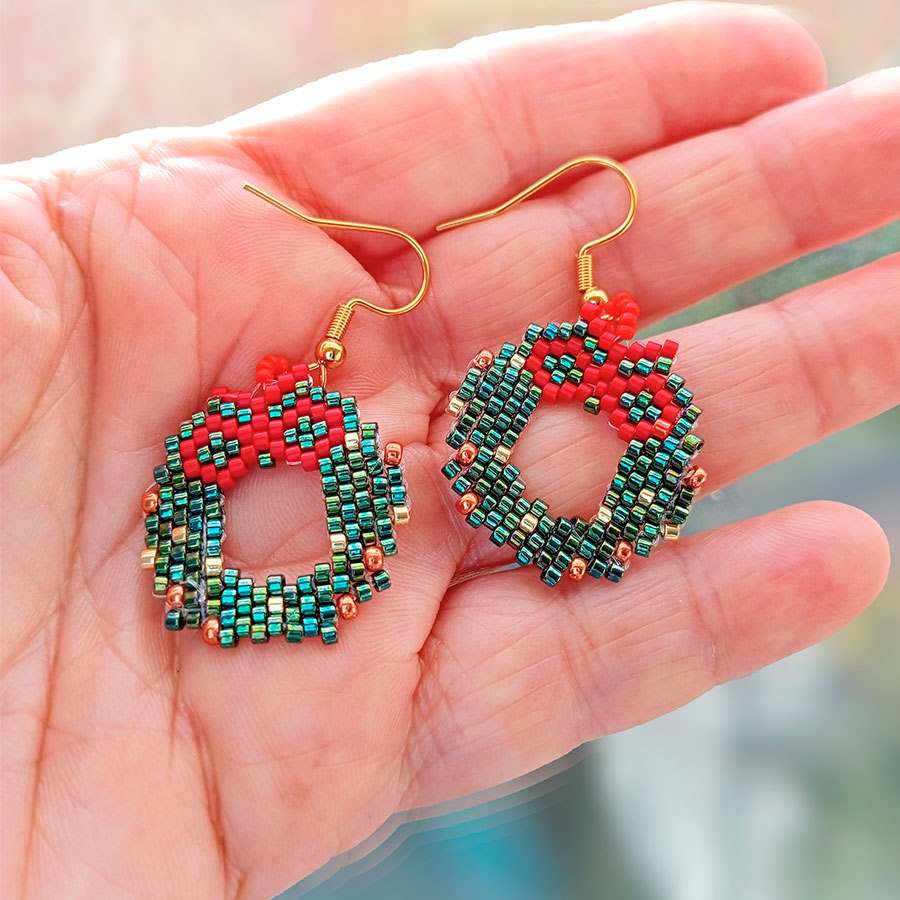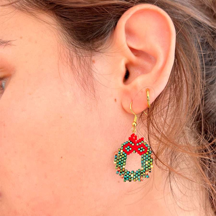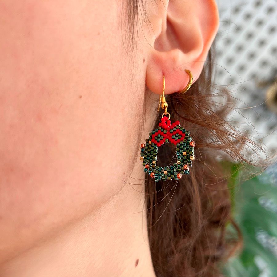 Estos Pendientes Corona Navidad son una pieza creada con dedicación, calma y precisión, siguiendo los principios de la slow jewelry fashion. Cada corona está tejida a mano, cuenta por cuenta, utilizando cristal japonés Miyuki, reconocido por su brillo, calidad y uniformidad.