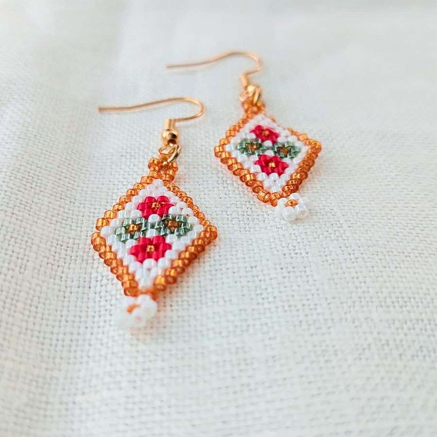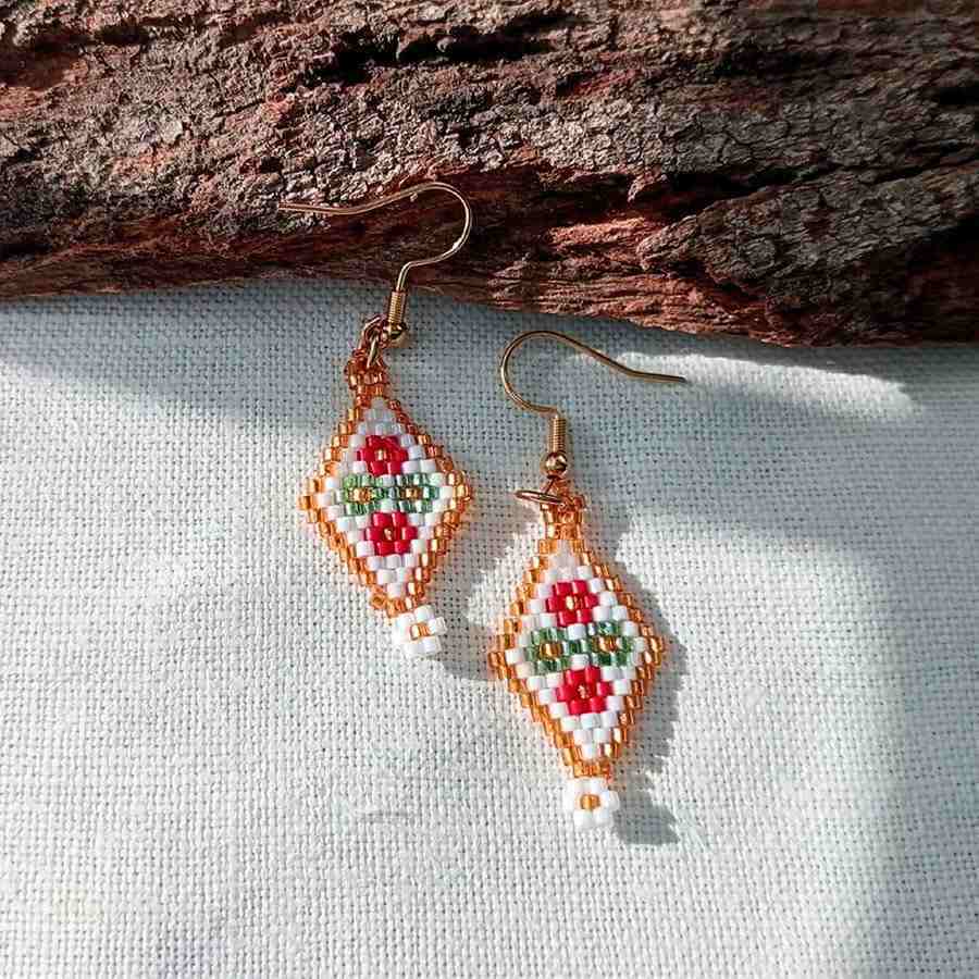 Estos pendientes de cuentas rombo presentan un estilo alegre y encantador; las pequeñas florecitas aportan alegría a tu outfit