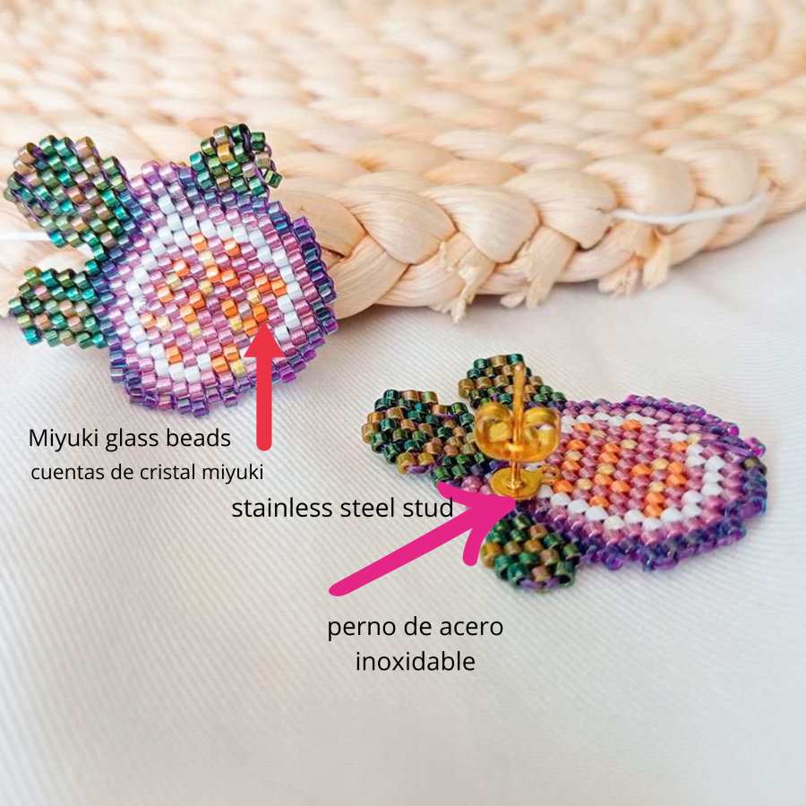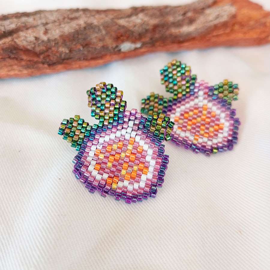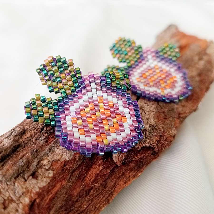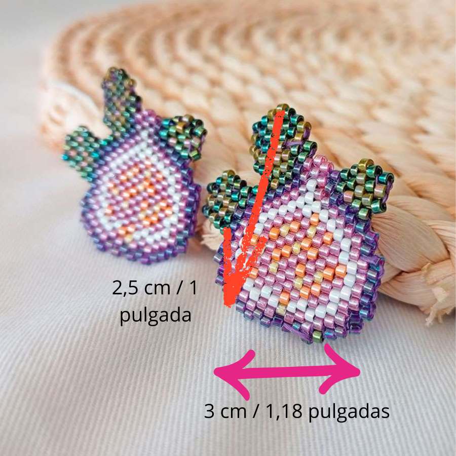 Los pendientes fruta higo son una pieza única de joyería artesanal diseñada para quienes aprecian el detalle, el color y la filosofía slow fashion. Cada par está elaborado completamente a mano con cuentas de cristal Miyuki de alta calidad, siguiendo una técnica de tejido minuciosa que da vida a la forma del higo con sus hojas en tonos verdes y morados. Estos pendientes son tipo stud, se colocan pegados a la oreja y no cuelgan, ofreciendo comodidad sin renunciar al estilo.