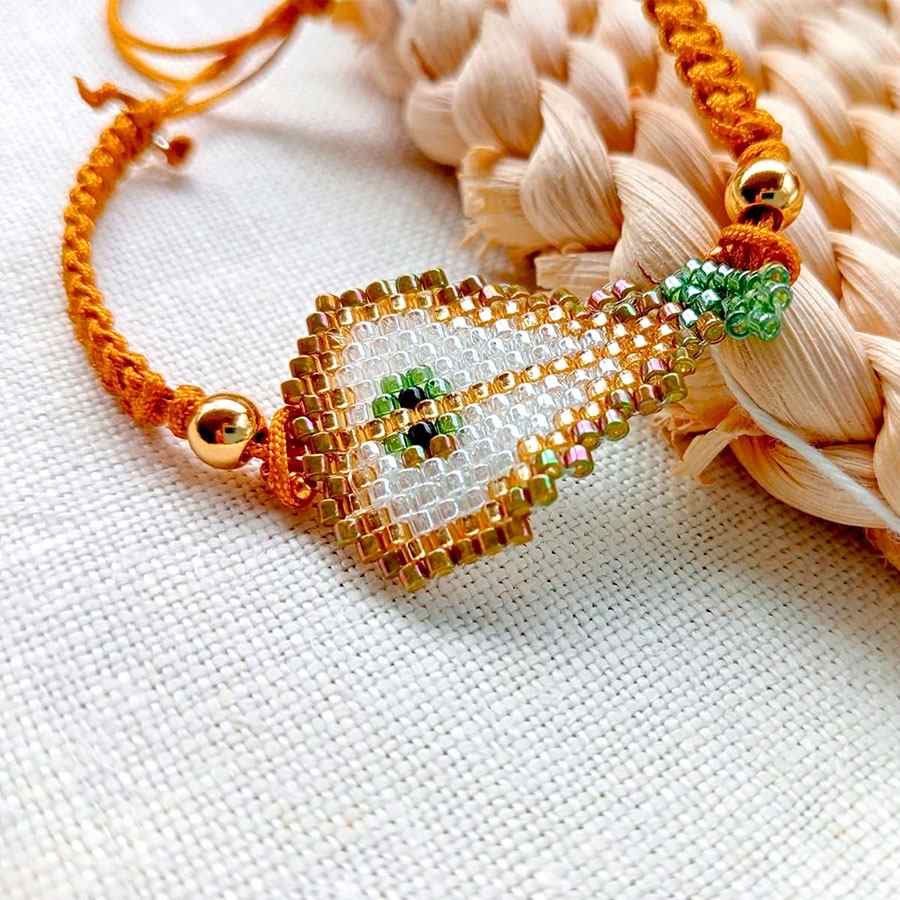 La pulsera fruta pera cuenta con un cierre ajustable deslizante hecho también con la técnica macramé, lo que permite adaptarla fácilmente a cualquier tamaño de muñeca. Su ligereza y suavidad la hacen ideal para llevar todos los días, sola o combinada con otras piezas de estilo artesanal.