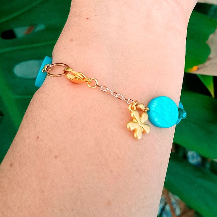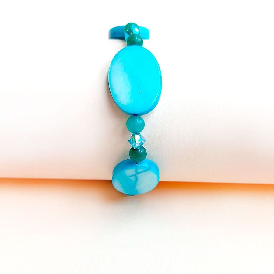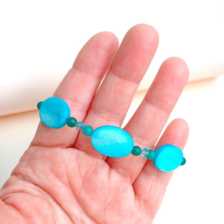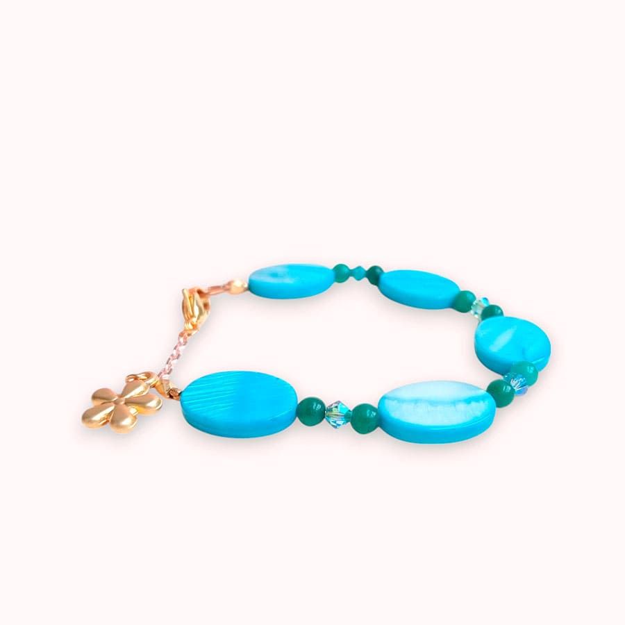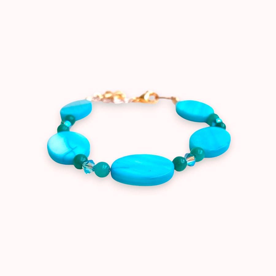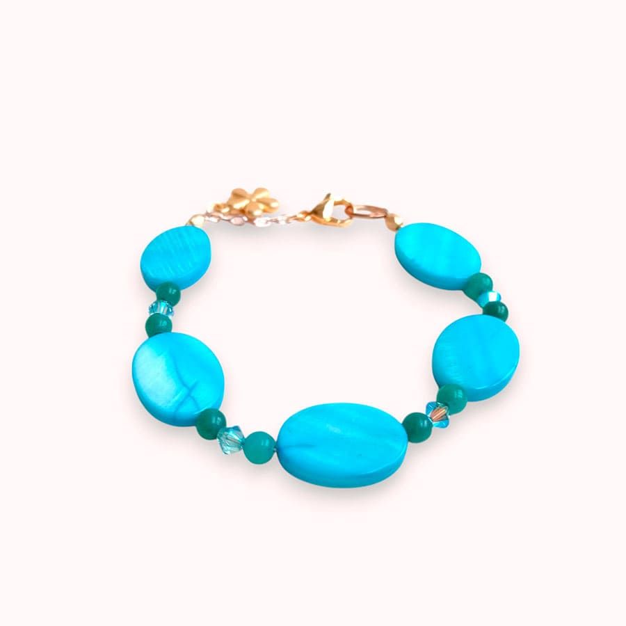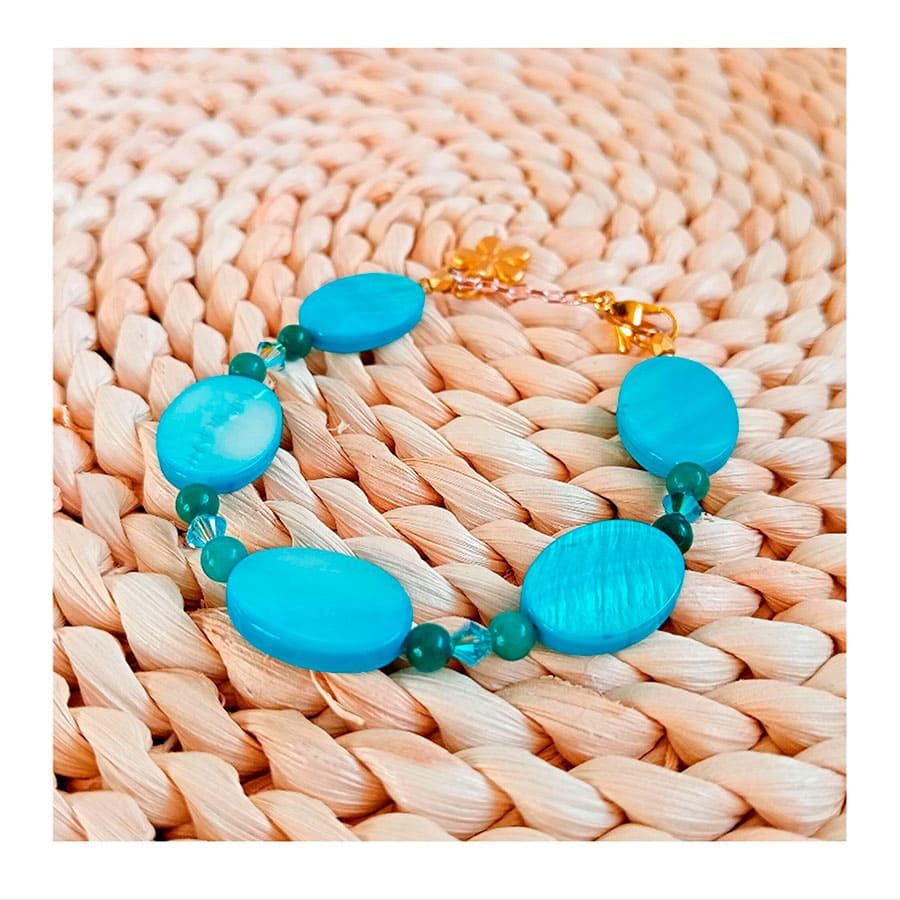 Esta Pulsera de Nácar Azul, la he diseñado con mineral de nácar, en cuentas planas, lo que le da un toque auténtico y diferenciador.