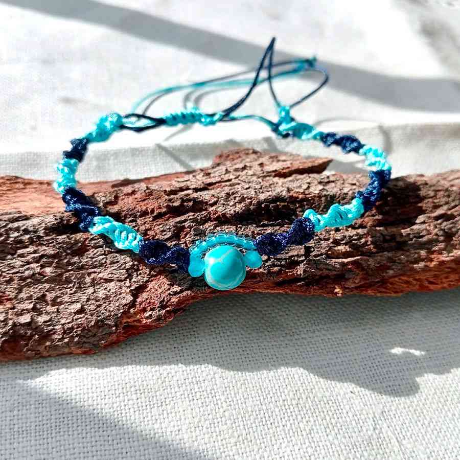 La pulsera turquesa macramé, está hecha a mano con cierre ajustable y deslizante, ideal para mujeres con estilo boho chic. Lleva una bola central de Howlita natural reconstruida, símbolo de protección y energía positiva. Ligera, versátil y perfecta para cualquier ocasión.